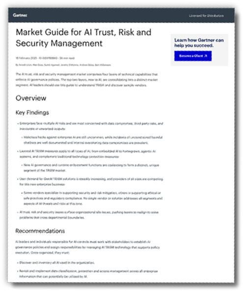 Read the Market Guide for AI Trust, Risk and Security Management by Gartner®, and get ready to truly protect your organization’s AI security.